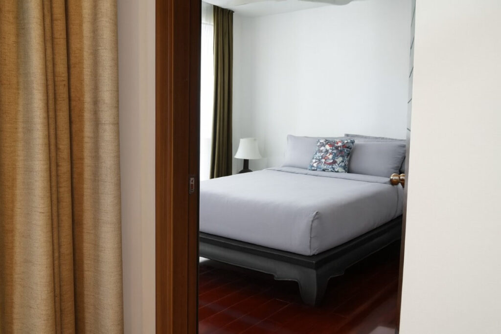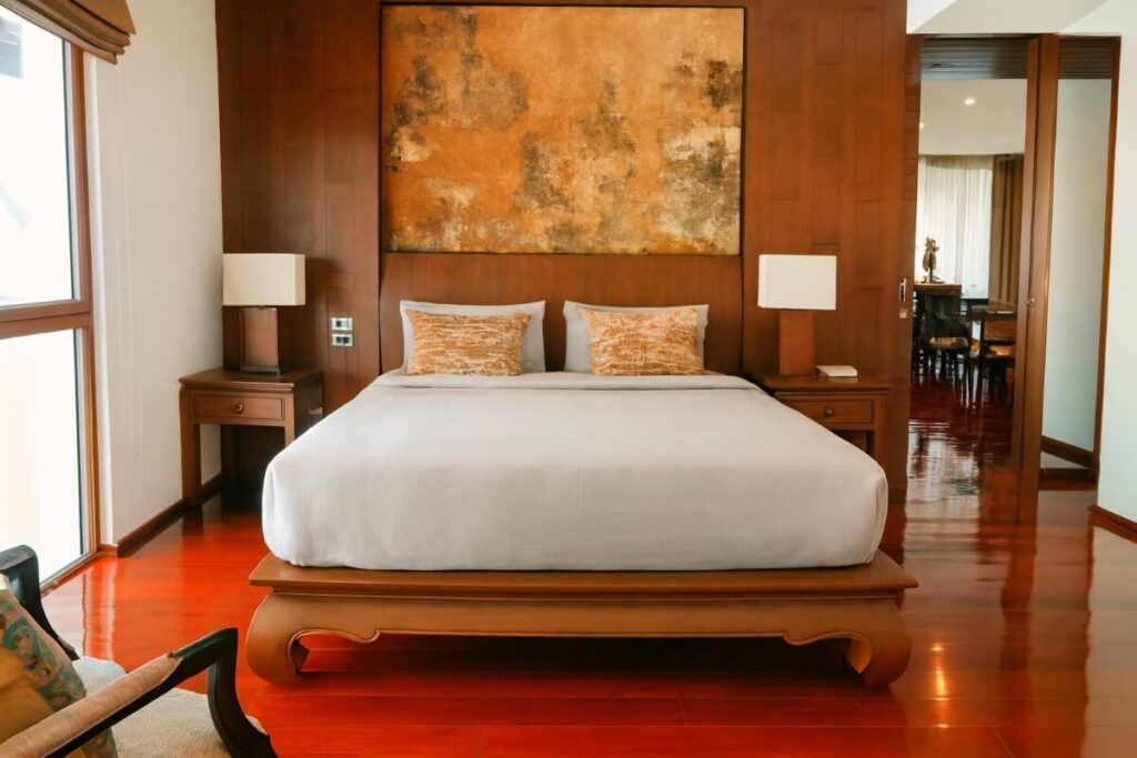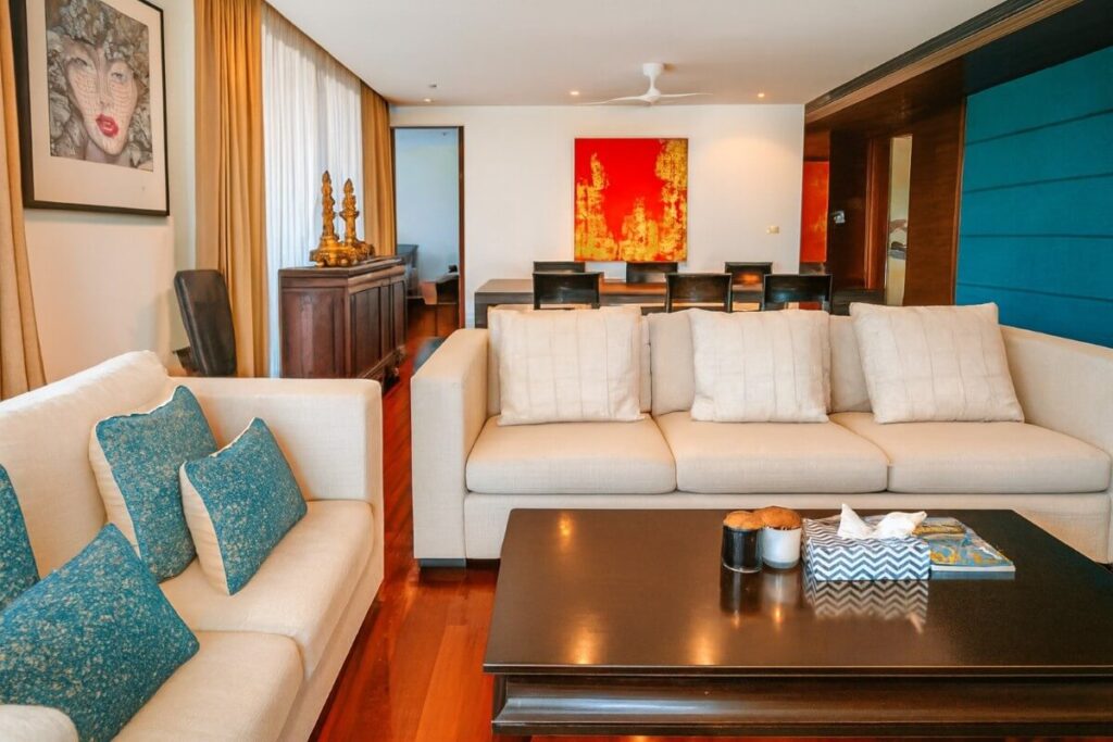 One of only a few penthouse units in this large-scale waterfront development on Phuket’s east coast, this fully furnished 3-bedroom condo sits directly on the marina with open water views and a private rooftop deck offering 360-degree views across the marina and coastline – among the best elevated outlooks in the development. The interior is finished with mahogany-coloured wooden flooring, plush white sofas, and dark wood dining and living furniture, with teak pieces used throughout the bedrooms and Thai-style sculptures, wall art, and cushions adding character throughout.
