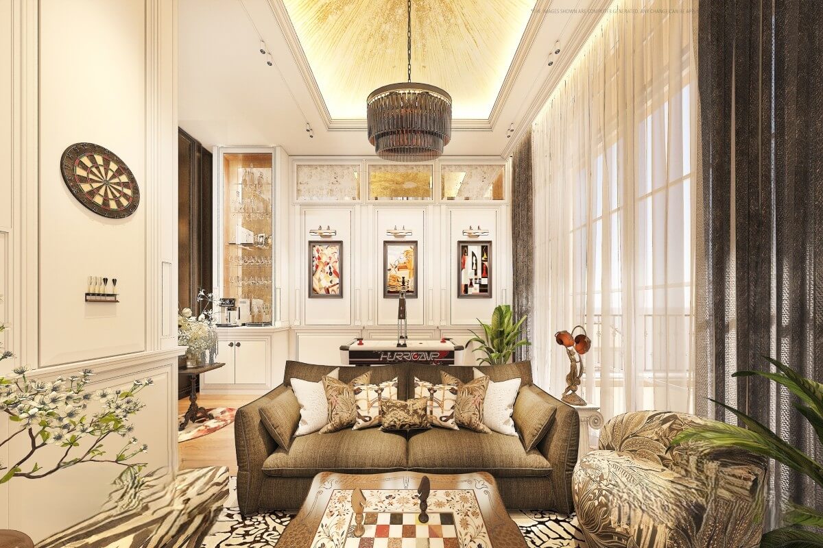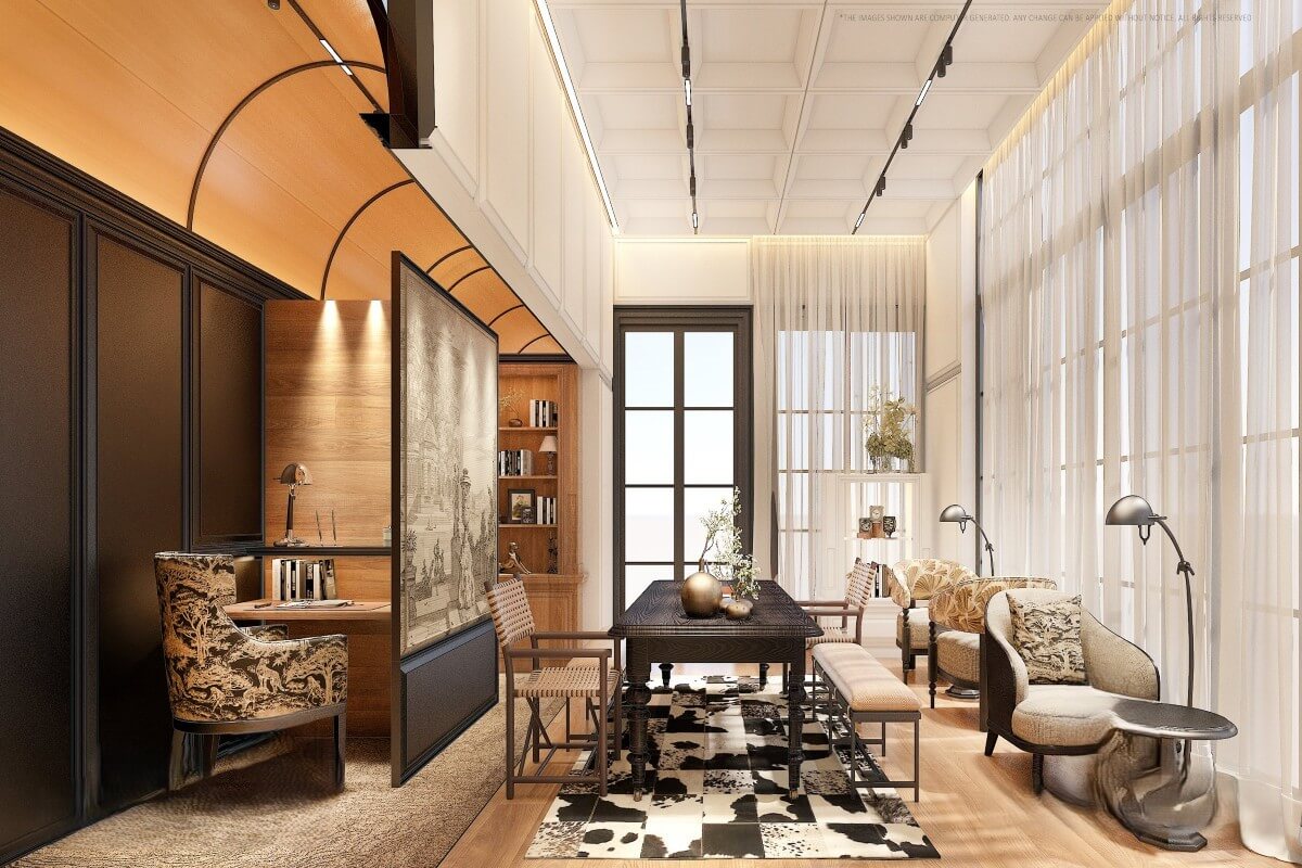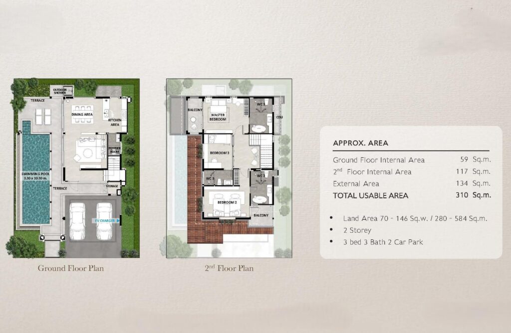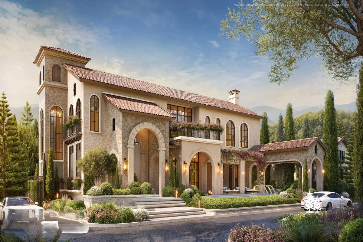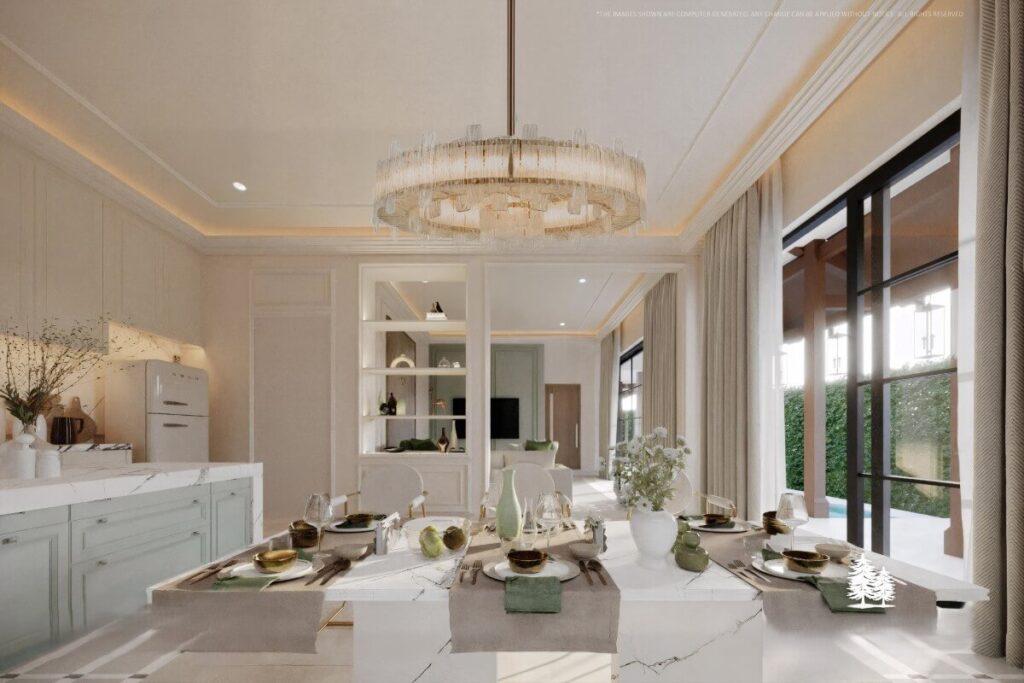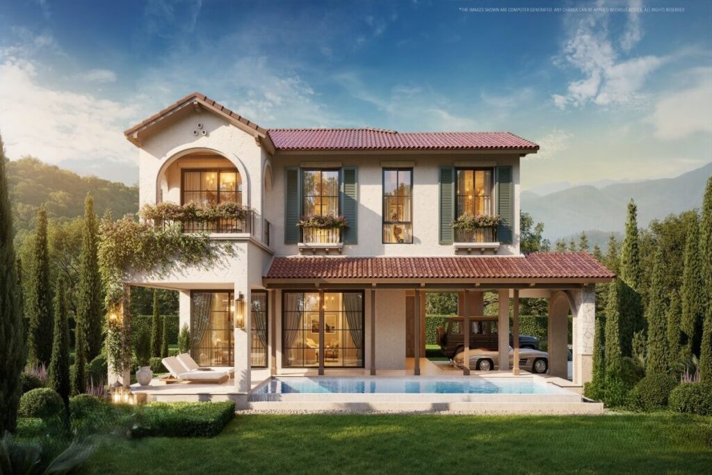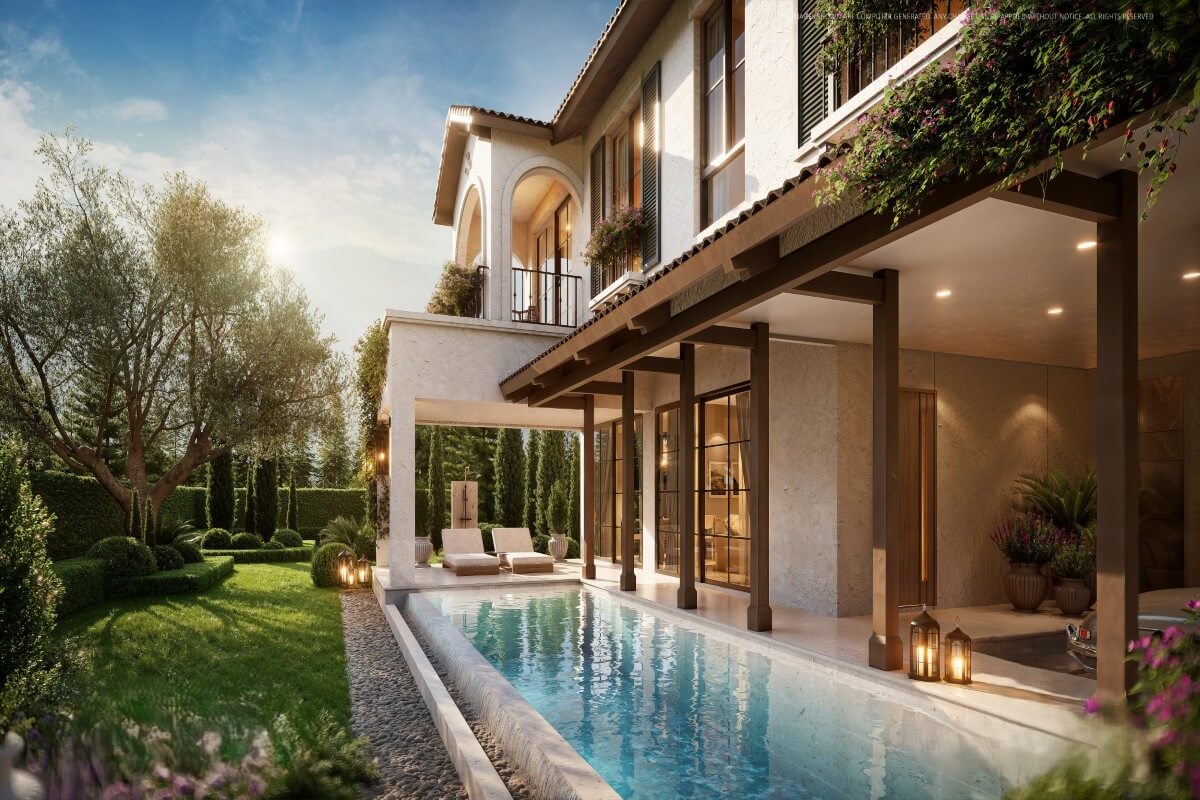 The design incorporates elements influenced by European architecture, including arched details and natural materials, combined with a layout suited to tropical conditions. The plot is fully enclosed, providing privacy, and includes parking with provision for electric vehicle charging.