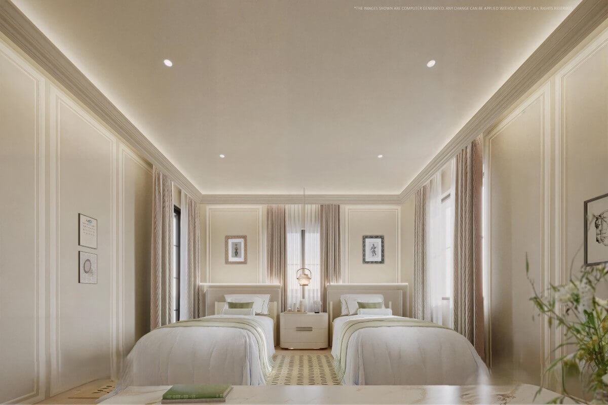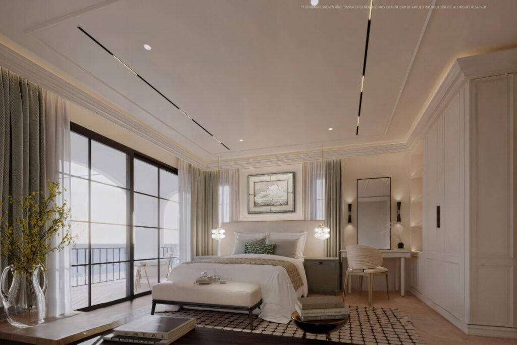 All three bedrooms are positioned on the upper floor, each with its own en-suite bathroom and access to a private balcony. This separation between living and sleeping areas creates a clear and functional layout across the villa.
