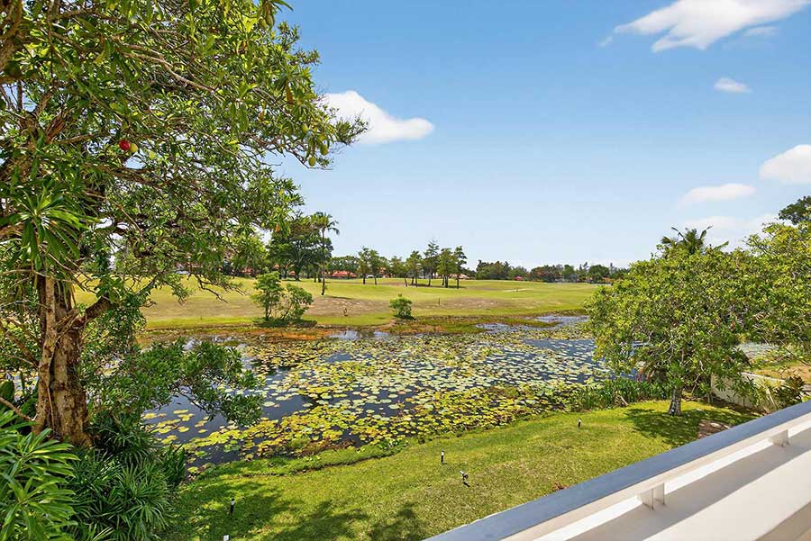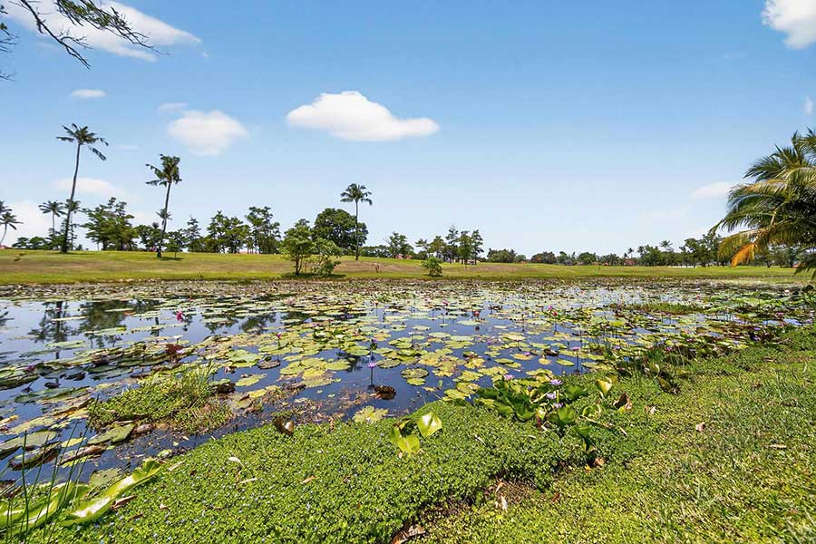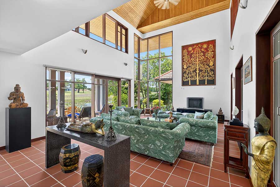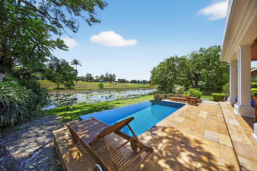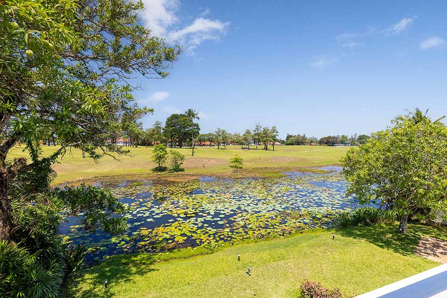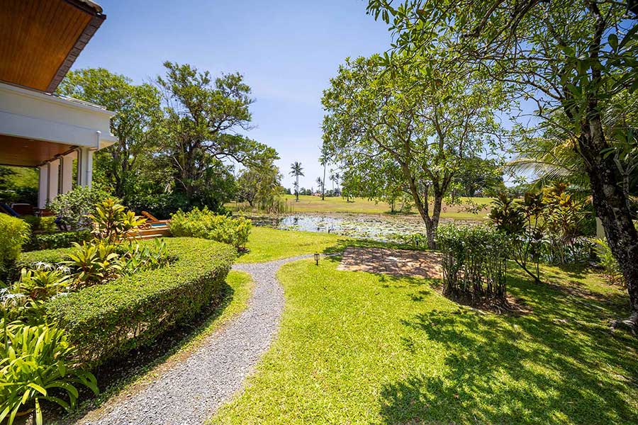 Overlooking the 14th fairway within Laguna Phuket, this 4-bed golf front villa is positioned on a 1,650 sqm Chanote-titled plot, offering direct views across the course and a level of privacy created by mature tropical landscaping. The setting is defined by open sightlines across the fairway, with a lotus pond positioned between the garden and golf course, forming a natural visual break and focal point within the outdoor space.