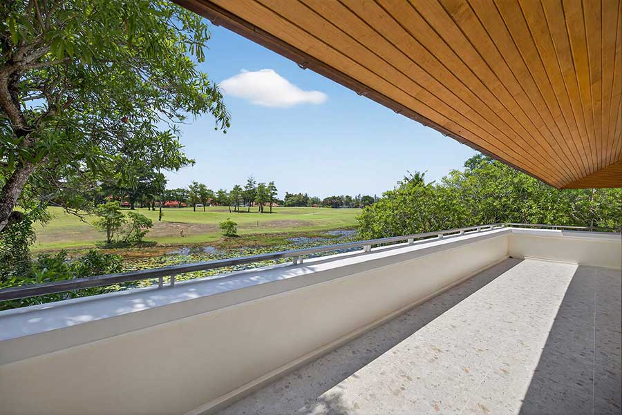 Outdoor living is structured around a private swimming pool with adjacent sun decks and shaded seating areas. The size of the land allows for multiple outdoor zones, with landscaped gardens extending across the plot and framing views toward the golf course. An elevated terrace on the first floor provides an additional vantage point, offering open views across the fairway and surrounding greenery.