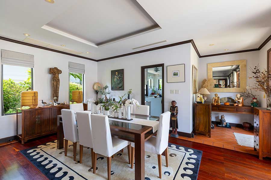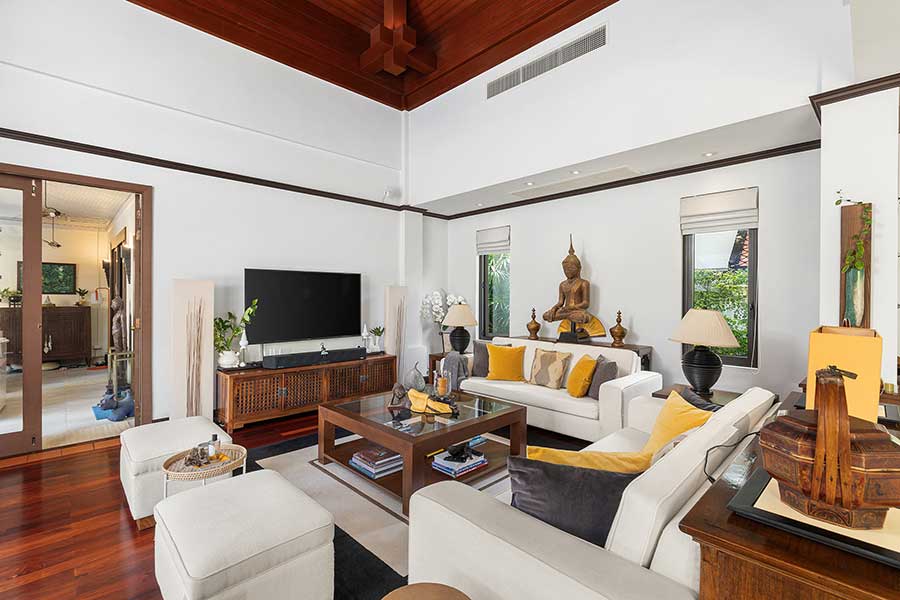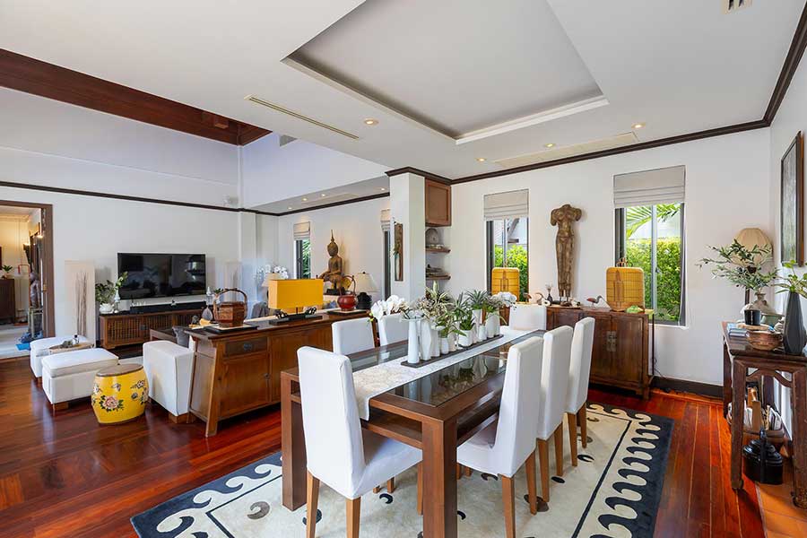 The ownership structure is well established and straightforward. The villa is held via a dedicated BVI company, while the land is owned by a Thai company set up specifically for the property—an arrangement maintained by the current owners for many years. The estate itself is professionally managed by Knight Frank, with common fees of THB 25,000 per month covering gardening, pool service, waste collection, upkeep of the shared areas and 24-hour security. Utilities are charged at standard local rates of THB 4.03 per kWh for electricity and THB 23.67 per cubic metre for water.