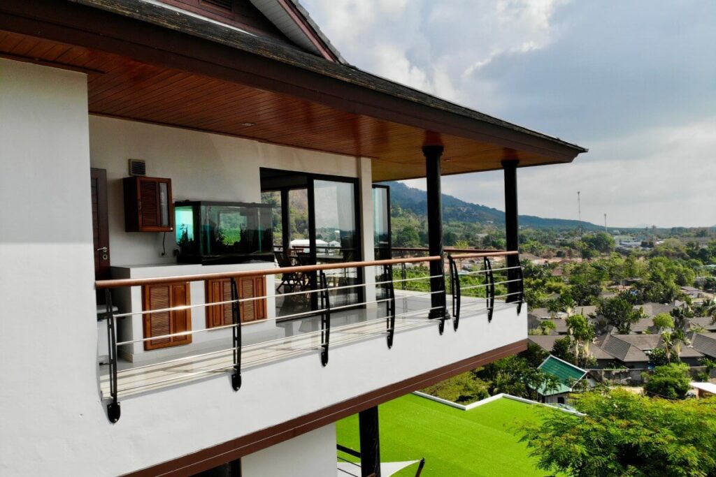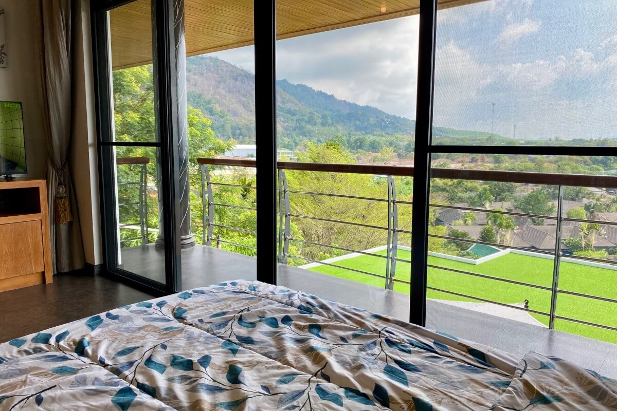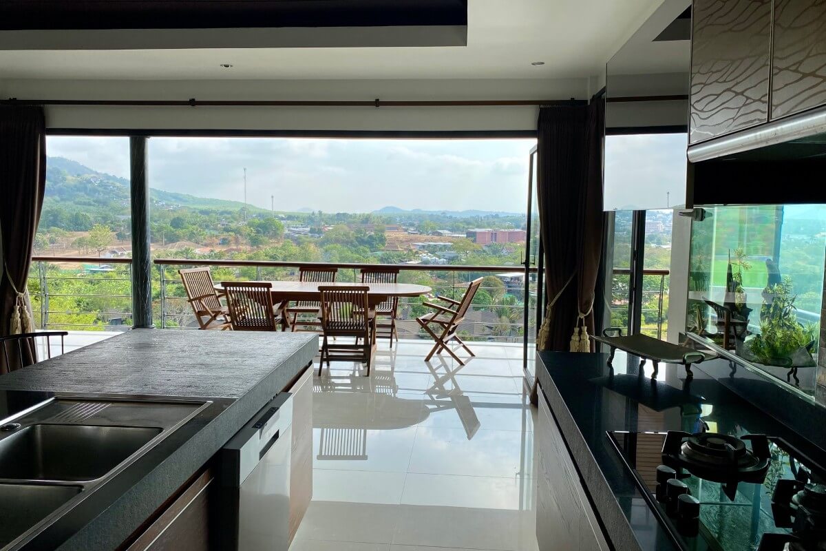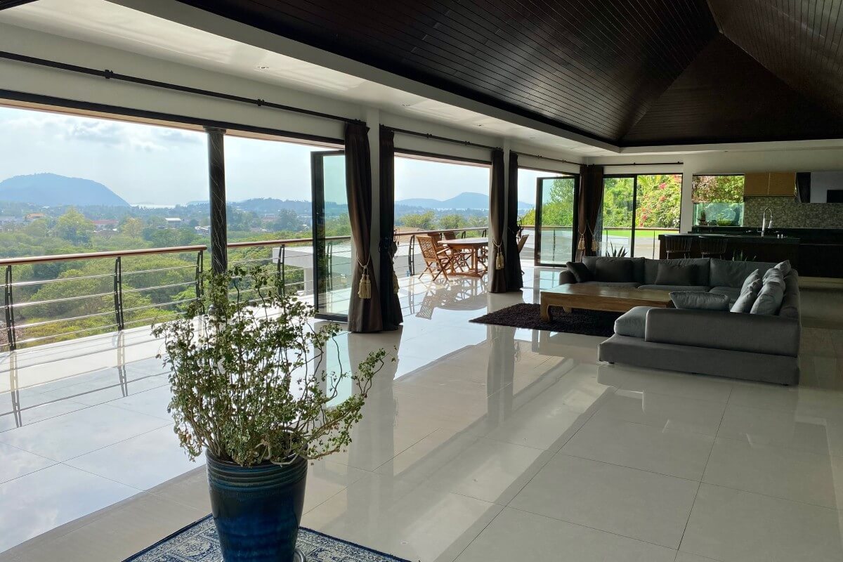 The estate occupies an elevated position within a low-density residential area and benefits from panoramic hillside views, regular sunrise outlooks, and occasional sea glimpses on clear days. Its location also provides cooler conditions than the valley below, while remaining within short driving distance of Nai Harn and Rawai amenities.