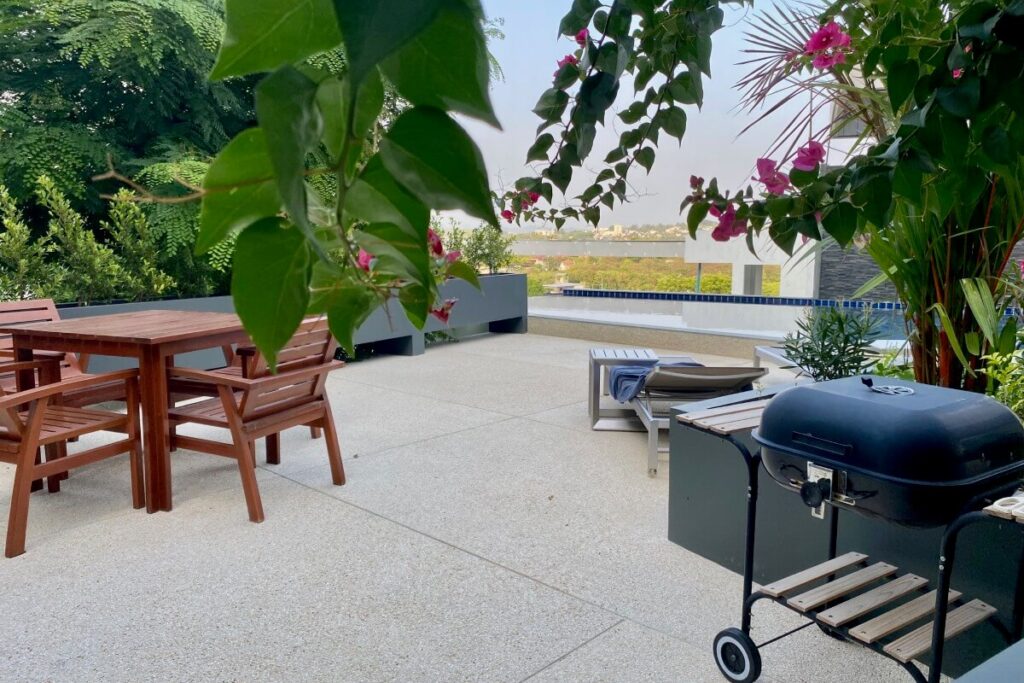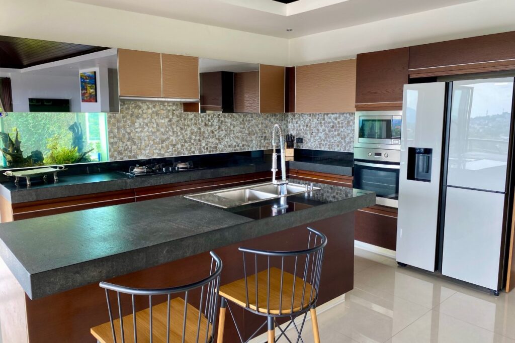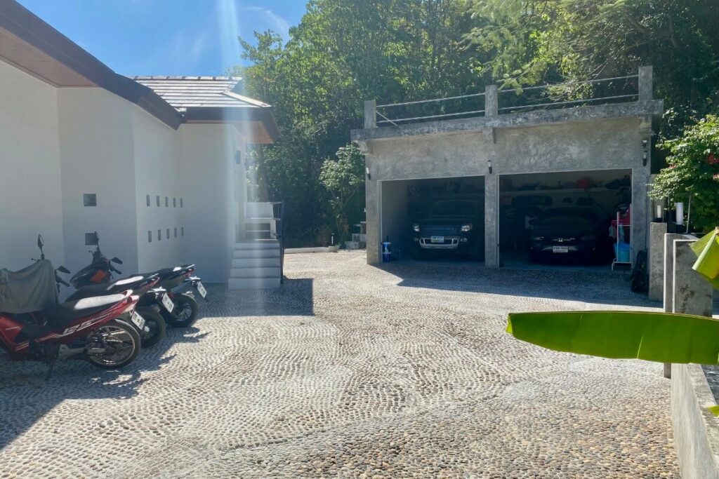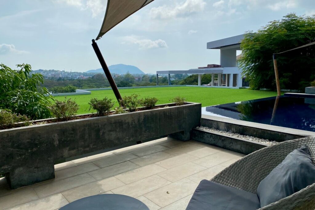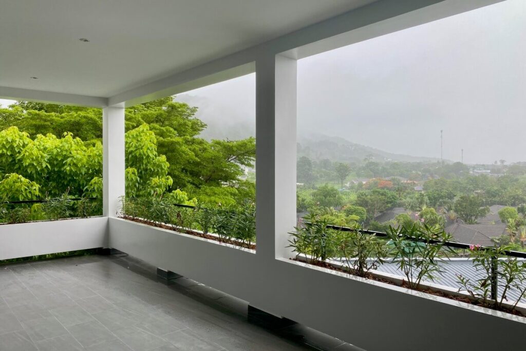 The estate occupies an elevated position within a low-density residential area and benefits from panoramic hillside views, regular sunrise outlooks, and occasional sea glimpses on clear days. Its location also provides cooler conditions than the valley below, while remaining within short driving distance of Nai Harn and Rawai amenities.