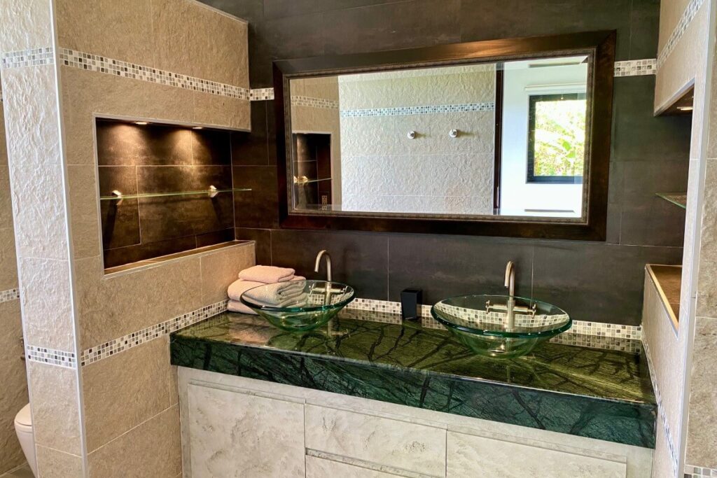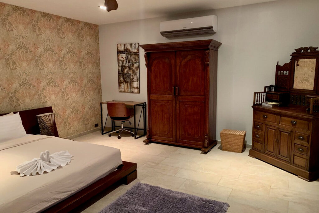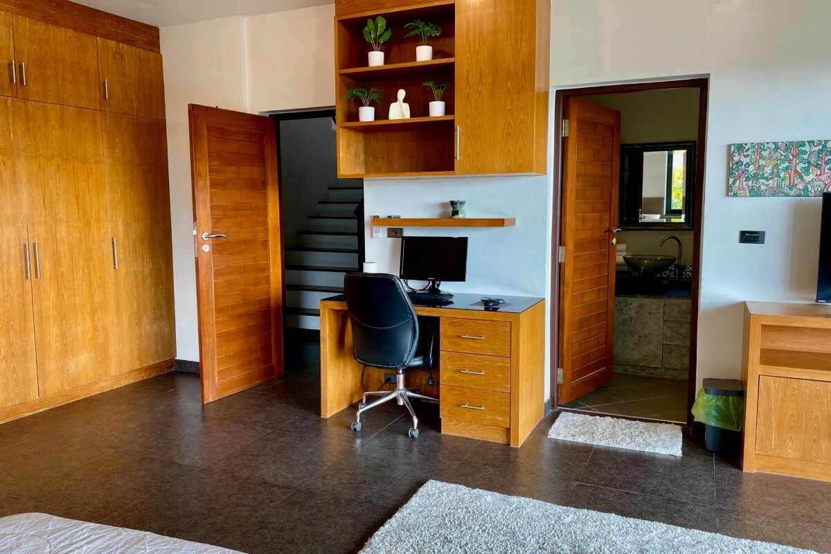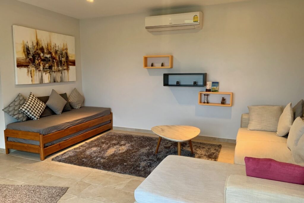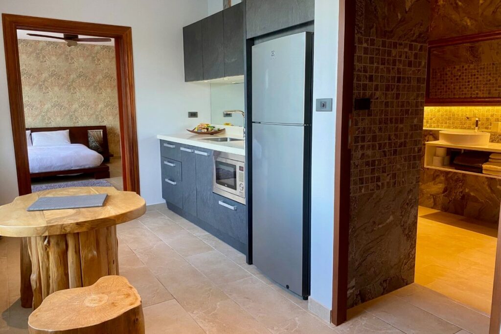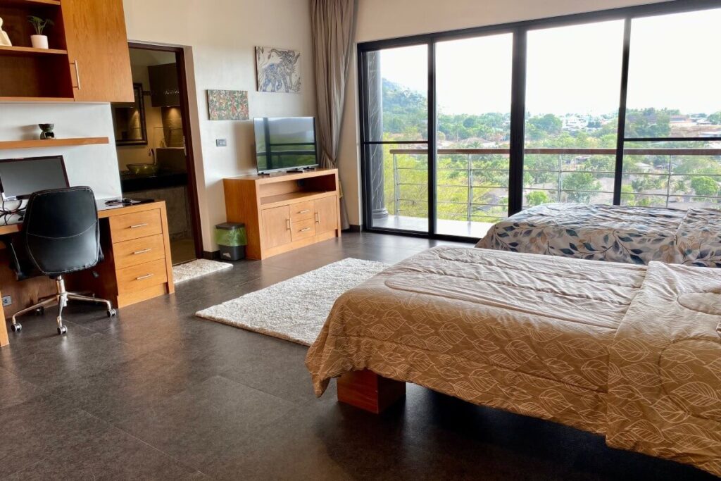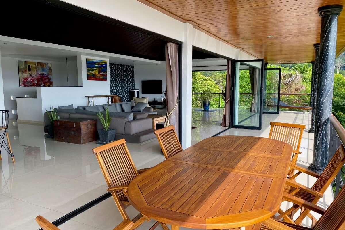 The primary Treetop Villa was completed in 2014 and spans 260 sqm across two levels. The upper floor is arranged around open-plan living, dining, and kitchen areas that open directly onto a wraparound covered balcony with wide-angle views. Two en-suite bedrooms are located on the lower level, providing privacy from the main living space. Positioned on the ground floor beneath this villa is a 140 sqm apartment completed in 2019, which includes its own living area, kitchenette, one bedroom, one bathroom, a private terrace, and a dedicated infinity pool.