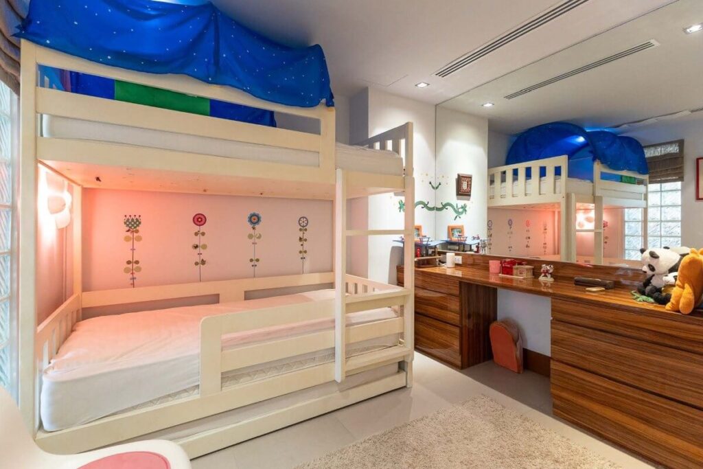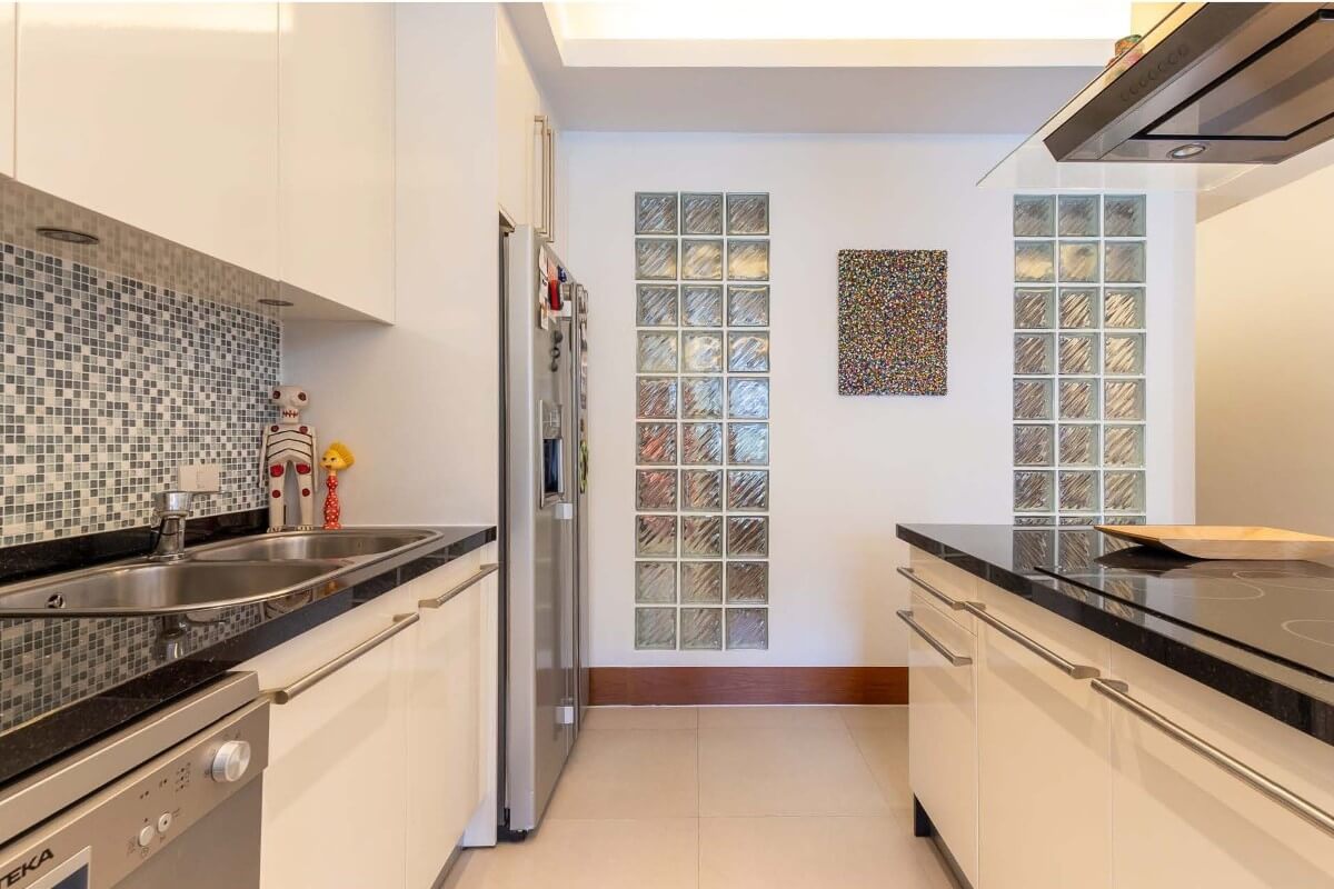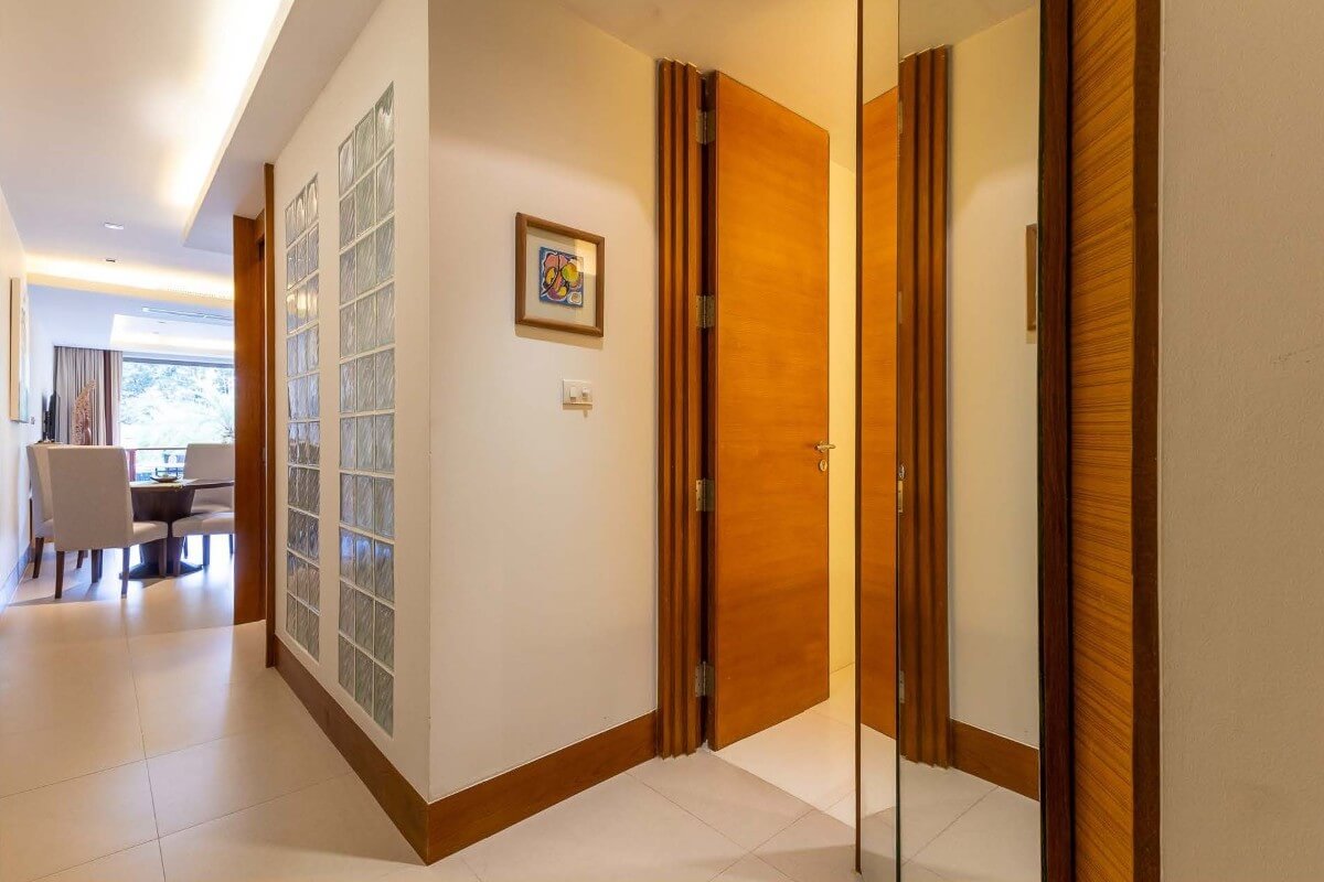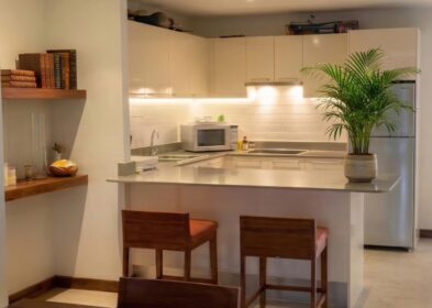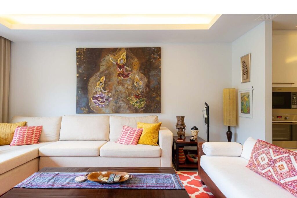 The 110 sqm layout follows a long and narrow floor plan designed for a natural flow from private to shared spaces. Entry takes you past the master bedroom with its ensuite, followed by a second bedroom with access to a shared guest bathroom, before the space opens into a combined dining and kitchen area leading through to the living room. At the far end, the living area opens onto a private balcony overlooking the pool. The interiors are stylish and contemporary, with tropical accents and vibrant pops of colour throughout.