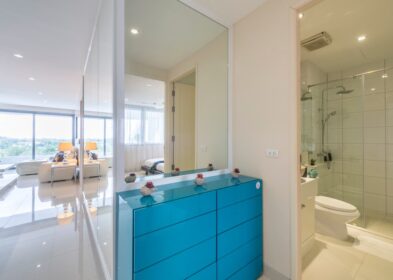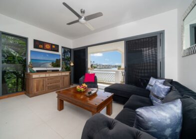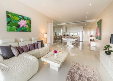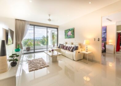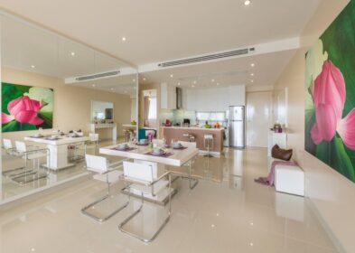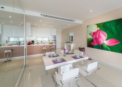 The apartment combines Asian-inspired interiors with Western comfort. Open-plan living areas are finished with modern materials, while expansive balconies extend the living space outdoors. High-end fixtures and contemporary furnishings balance practicality with a sense of tropical style.