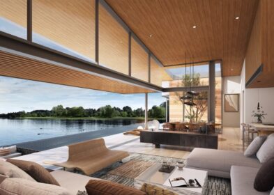 Full-height glass doors opening to the pool terrace