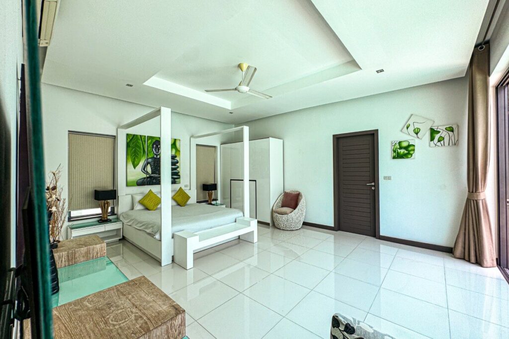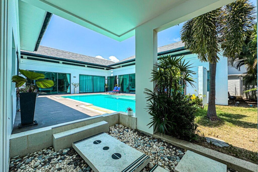 This 4-bed pool villa, offered for sale fully furnished, is located in the Rawai area of Phuket just off Saiyuan Road, with a single-storey layout arranged around a central courtyard pool.