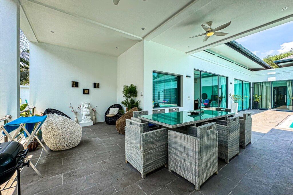 Externally, the villa features a private swimming pool measuring approximately 12 x 5 metres, surrounded by a decked terrace. A covered outdoor seating and dining area is positioned alongside the pool, with additional garden space within the enclosed plot. High perimeter walls provide privacy throughout the property, while covered parking is included within the plot.