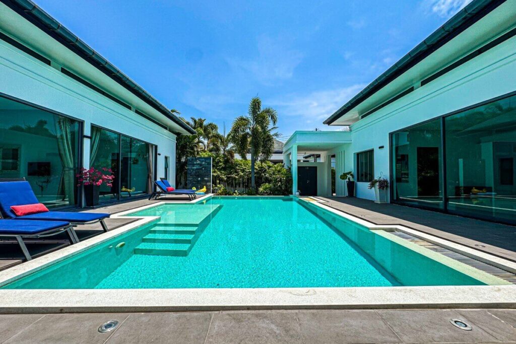 The villa provides approximately 364 sqm of built area on a 760 sqm plot, making it the largest plot within this small development. The layout follows a U-shaped configuration, positioning all rooms around the pool area, with direct access from each bedroom and the main living spaces. Large sliding glass doors and full-length windows allow natural light into the interior while maintaining a consistent connection to the outdoor space.