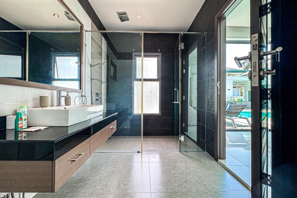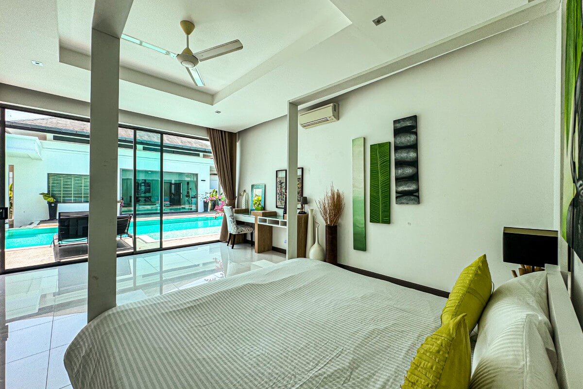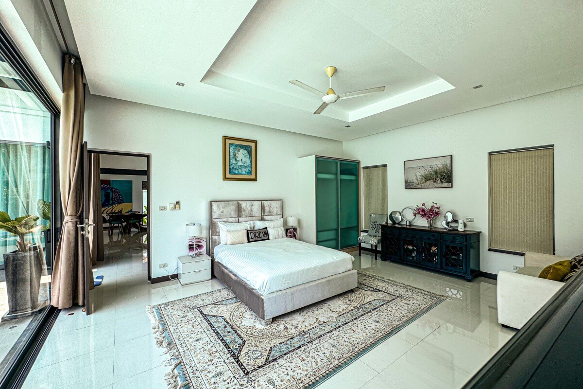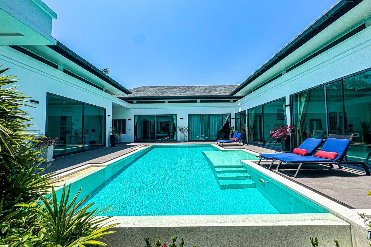 The villa provides approximately 364 sqm of built area on a 760 sqm plot, making it the largest plot within this small development. The layout follows a U-shaped configuration, positioning all rooms around the pool area, with direct access from each bedroom and the main living spaces. Large sliding glass doors and full-length windows allow natural light into the interior while maintaining a consistent connection to the outdoor space.