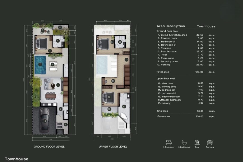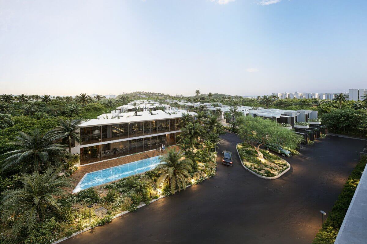 In addition to the two-bedroom villas, the development also includes larger three and four bedroom pool villas, as well as multi-level townhouses. Townhouse units are arranged over two storeys and provide alternative layouts for buyers seeking a more compact footprint while still benefiting from private pool living and access to shared facilities.