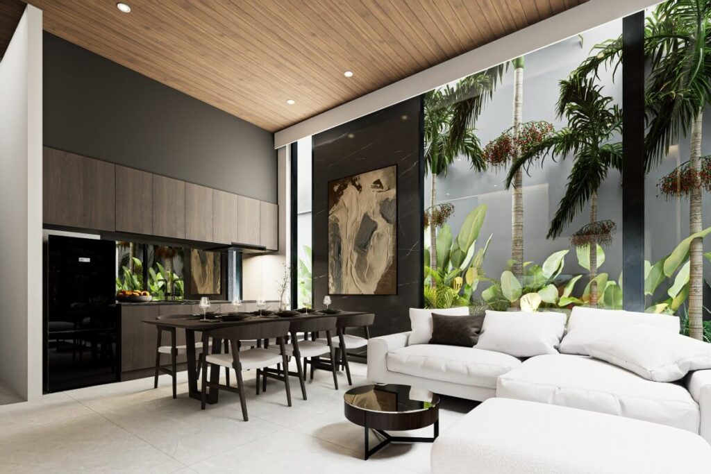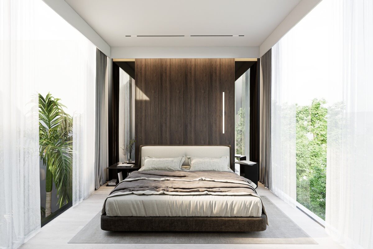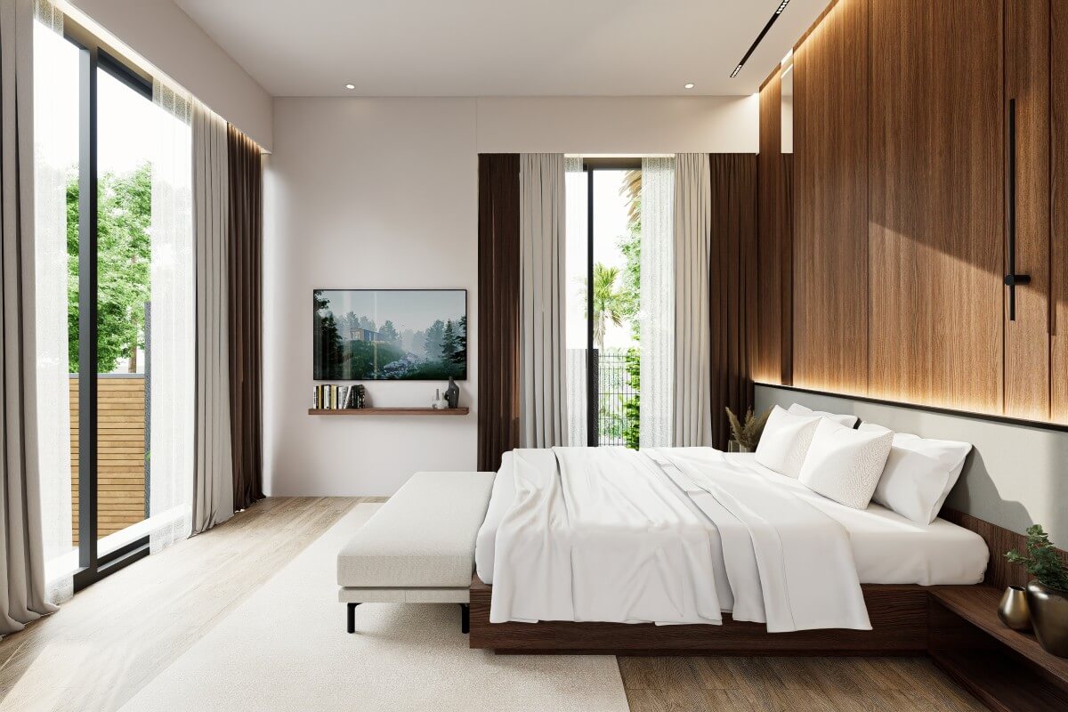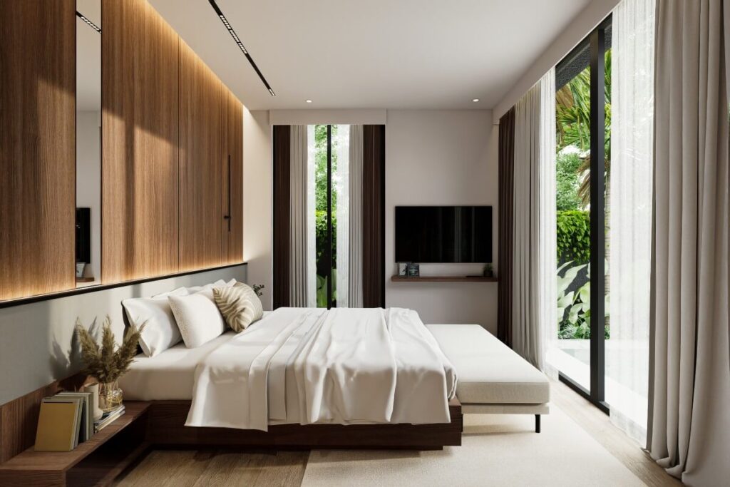 The development follows a modern tropical, cube-style architectural concept, with floor-to-ceiling doors and windows allowing natural light to flow throughout the interiors. Wooden bedroom flooring and warm wood accents are used to soften the contemporary design and create a practical, easy-to-maintain living environment suited to everyday use or investment.