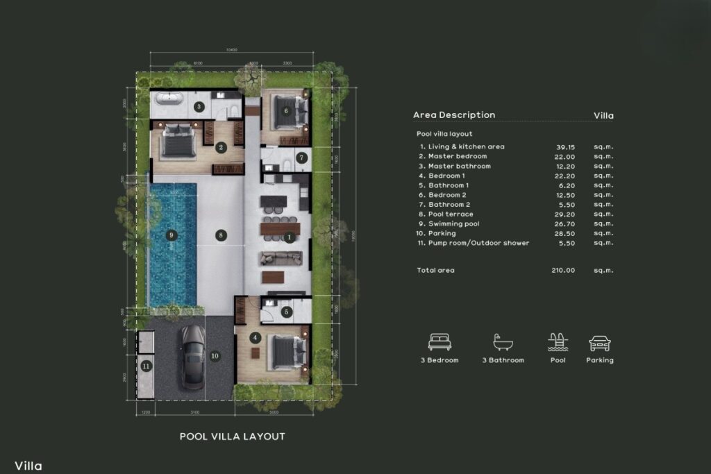 Two-bedroom villas within the project offer built-up areas of approximately 150 sqm and are arranged around open-plan living, dining, and kitchen areas that connect directly to the private pool. Each villa includes three bathrooms, secure on-site parking, and a fully enclosed plot, providing privacy while keeping maintenance requirements manageable.