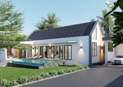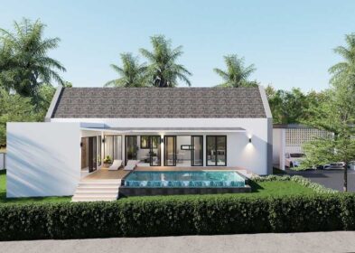 Designed with a contemporary tropical style, the villa features high beamed ceilings and a cedar shingle roof, complemented by handpicked wooden finishes. The open-plan living and dining areas are filled with natural light, creating a seamless flow between indoor and outdoor spaces. The modern kitchen is equipped with high-spec white fittings and provides ample space for cooking and entertaining.
