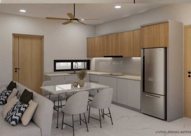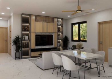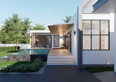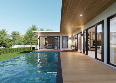 The villa’s outdoor area is perfect for relaxation and entertainment, with a 21-meter lap pool and a 4-meter children’s pool. A spacious sunken sala offers the perfect spot to unwind while enjoying the serene surroundings. The landscaped gardens, featuring coconut trees and tranquil lotus ponds, add to the villa’s peaceful ambiance.